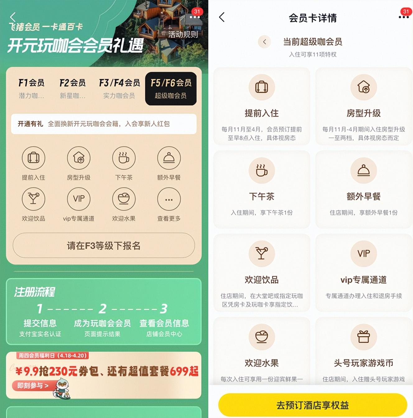 飞猪与开元森泊合作迎来升级,开元森泊正式与飞猪打通会员体系。飞猪F5、F6会员可直通开元玩咖会最高等级“S4超级咖会员”,体验11项专属权益。