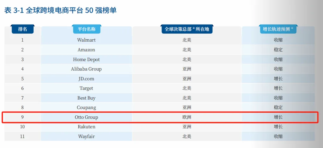 值得一提的是,在全球跨境电商平台50强榜单中(注:该榜单基于平台的财务表现、组织运营、全球布局、增长潜力等多维度的分析而形成),来自德国的Otto Group(欧图集团)是前十强中唯一的欧洲电商平台,且在未来12-18个月预期保持增长趋势。
