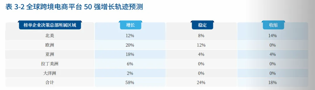 由上海社会科学院、渣打银行、《理财周刊》及邓白氏联合发布的《2023跨境电子商务报告》,对全球前50家跨境电商平台未来12-18个月的增长轨迹预测显示,其中58%将获得增长,24%保持稳定,18%有可能收缩,其中欧洲地区平台预期“增长”在所有地区中最高;而北美地区平台“收缩”占比最高。这无疑给广大跨境卖家加力拓展欧洲市场增强了信心。