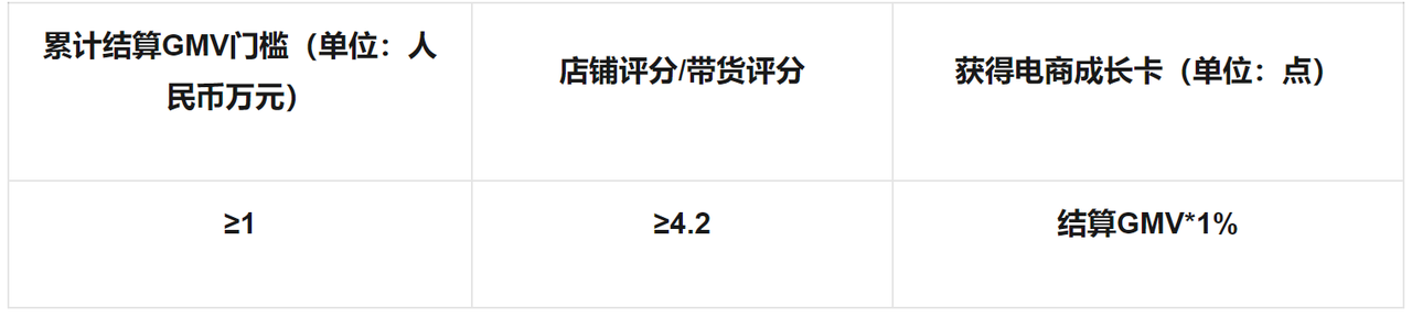 商家和达人获得GMV目标任务激励,需满足累计结算GMV≥1万元、店铺评分/带货评分≥4.2两个条件。活动结束后,商家和达人所获电商成长卡数量,将是累计结算GMV的1%。符合相关条件的达人还可申请大场实时激励扶持。