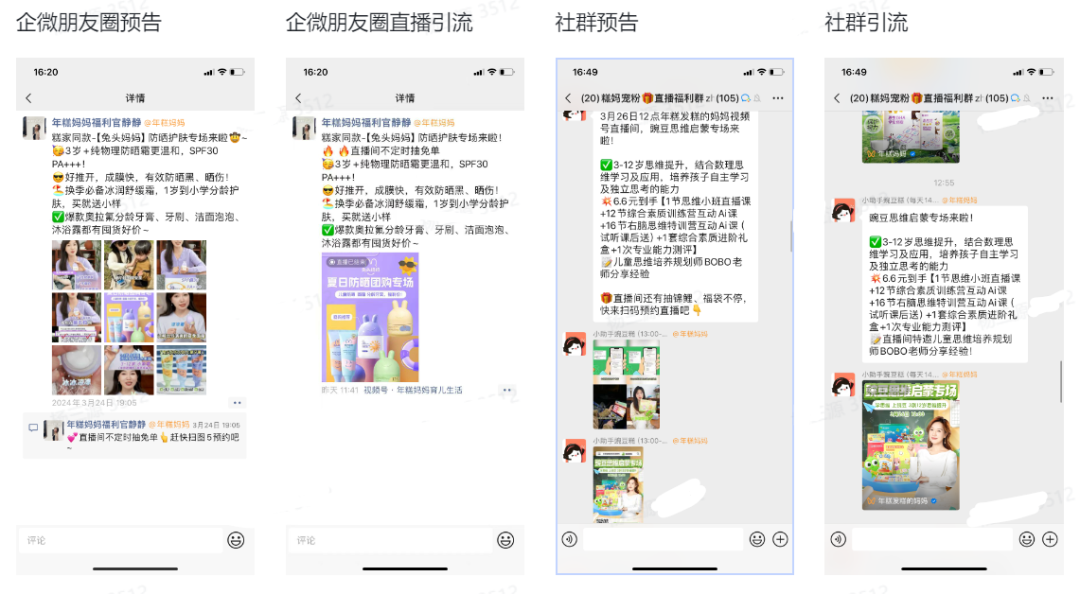 根据公众号矩阵引流动作推测,年糕妈妈曾分时段进行企微+社群引流,结合社群群称推测其引流主要目的为储蓄直播间流量池与日常转化,现不主动向企微/社群引流的原因: