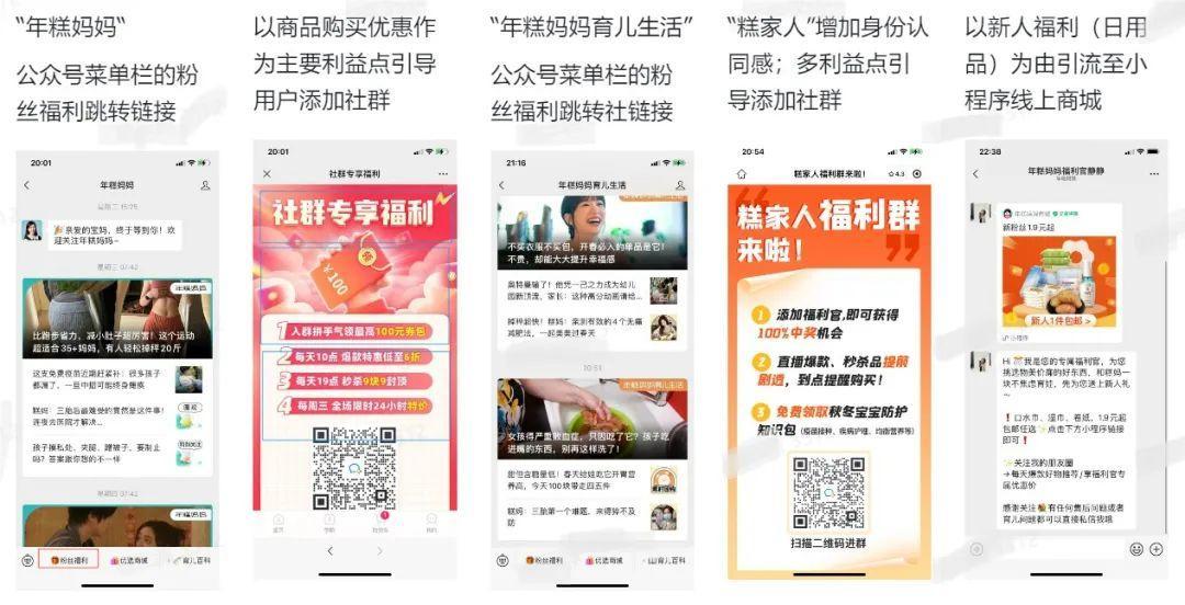 “年糕妈妈商城”以超值零食作为新人福利,通过推文和海报引导添加福利官,福利官以内购折扣和优惠券为由引流至直播福利群,形成完整链路。