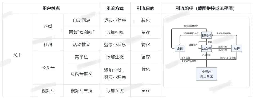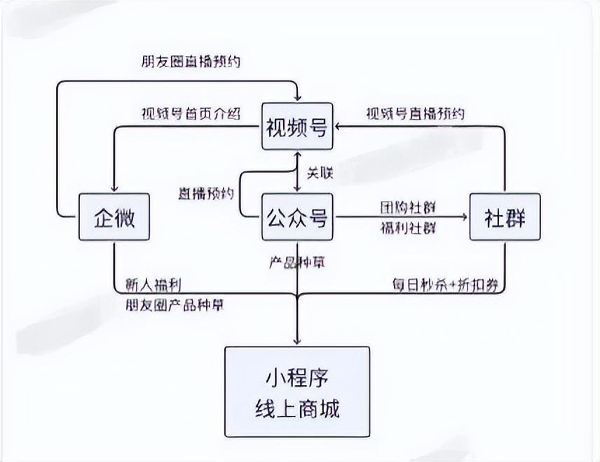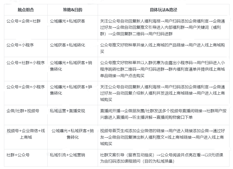 其具体表现为在公域以优质内容进行用户留存并培养忠实客户,利用私域小程序和视频号内容推流激发社交裂变,通过多触点(公众号、直播、朋友圈、社群)内容种草促成购买,再经由社群、小程序活动和主题性直播高频次触达私域用户,达到复购目的。