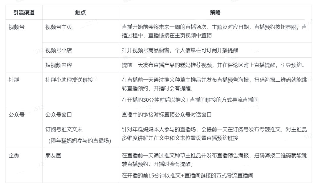 ②公域引流+私域反哺公域,多路径唤醒沉默用户:开播前一日多渠道铺设直播引流,开播半个小时后二次唤醒私域沉默用户,将其引流至直播间,引流内容为种草文案+预约链接/海报。