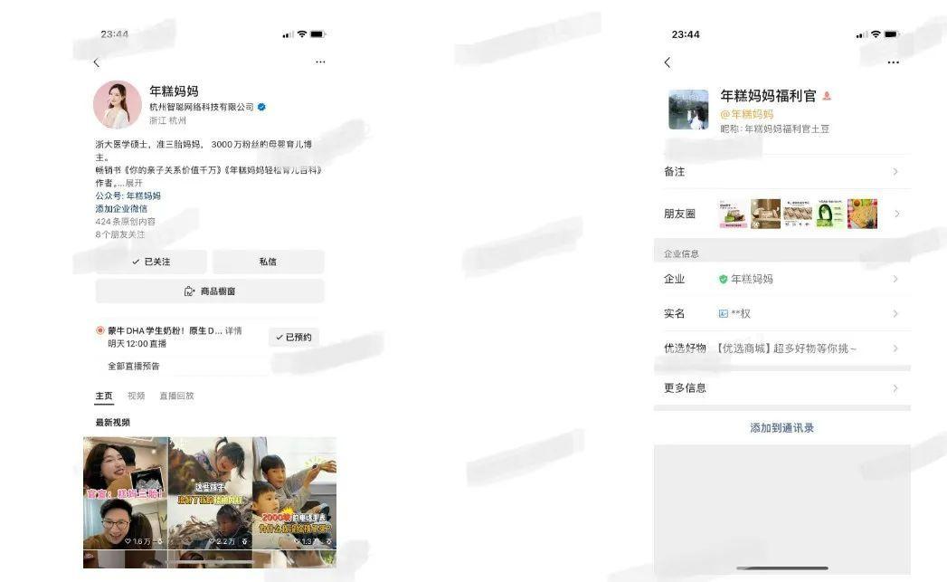 视频号首页设置添加企业微信的链接,无相关文案或利益点引导,其中主账号“年糕妈妈”链接的企微微信无法添加,另有5个视频号链接了企业微信。