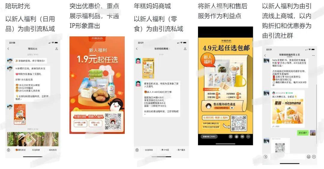 ①新人进入小程序时,首页大面积铺设新人福利内容,主题明确且视觉冲击感强;多重福利强化用户的收益感知,增强用户转化动力;产品多为母婴类刚需品或日用品,精准对应用户需求。