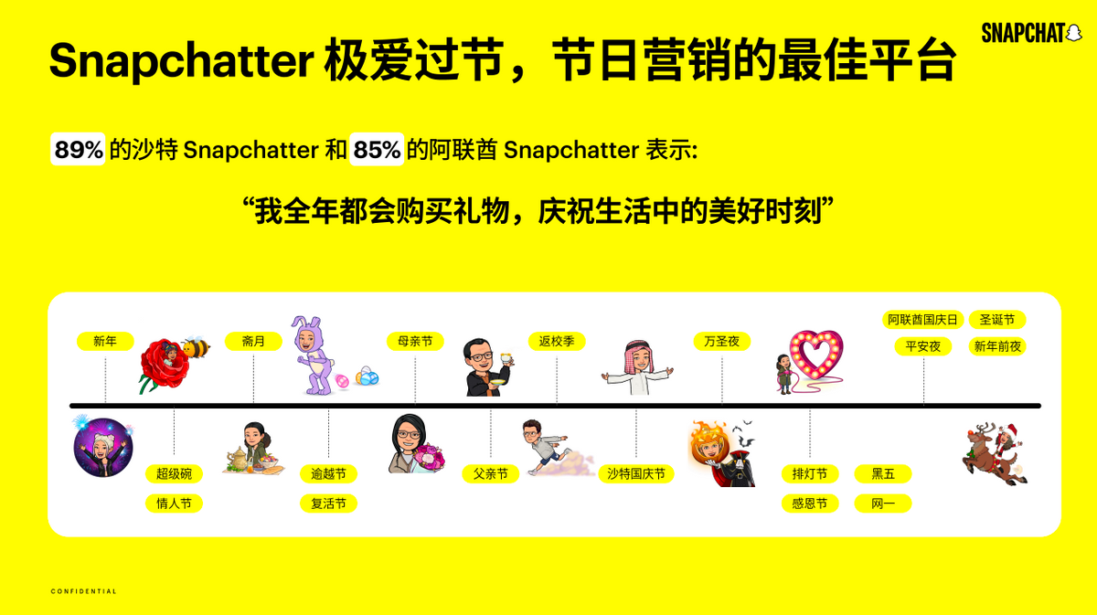 Snapchat 触及 20 多个国家和地区 90% 的 13–24 岁年轻用户。在中东这种增量蓝海市场,Snapchat 拥有大量忠实的用户,6,700 百万的人口中 90% 的人都在用 Snapchat,仅沙特地区就有 71% 的父母天天用 Snapchat。