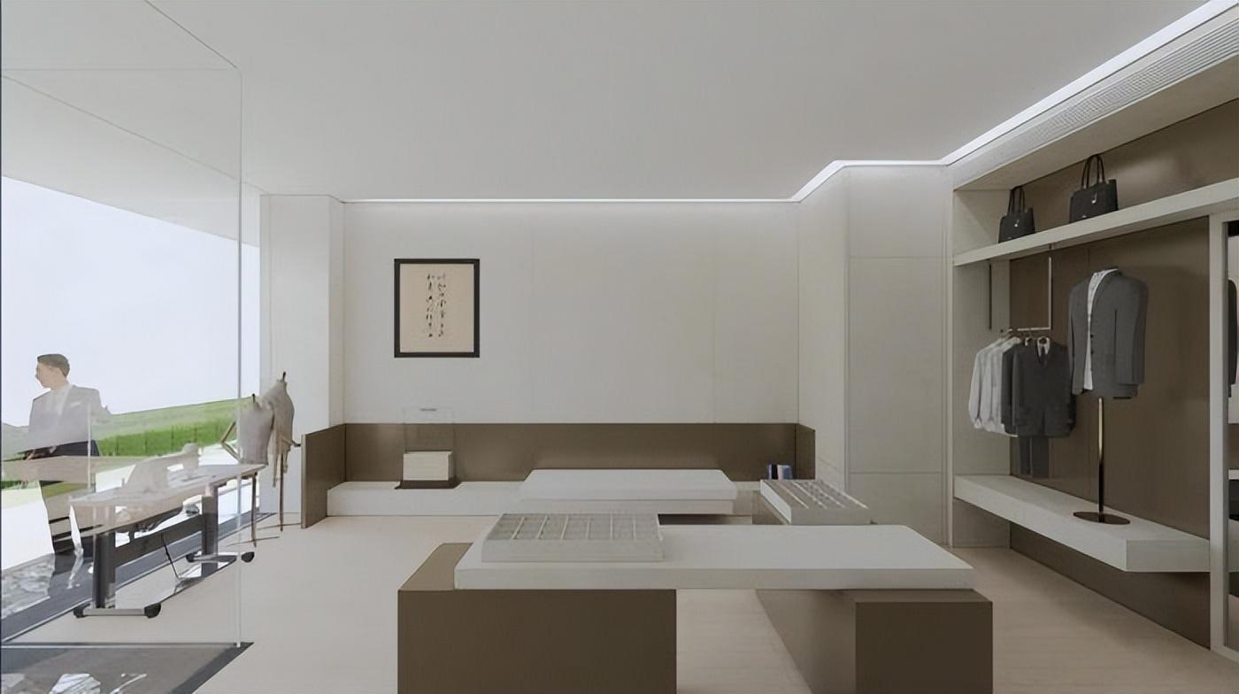 在视觉设计上,门店以经典中国山水风美学表达品牌国货内核,搭配色彩与产品高端调性相匹配。整体设计以柔和弧线为主,使得逛店动线流畅自由,并从细节出发摒弃传统的简单陈列,确保整体空间的和谐与统一,最大程度上给消费者沉浸式体验。空间上大面积的留白摆脱规则束缚,光线、空间和材质引导到消费者的情绪节奏,形成具有前瞻性的展陈方式,传达衬衫老罗以先锋性理念与创新式思维引领行业发展的态度。