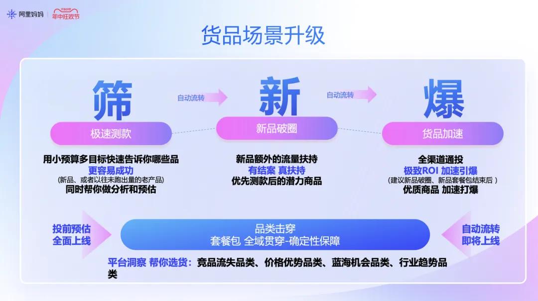 本次618,为帮助品牌突破行业壁垒实现破圈拉新,获取最潜在用户,阿里妈妈三大路径的第二步,是通过三款产品的三大极致能力,以及预热期和爆发期的推荐打法,帮助品牌商家提升精准人群推广能力,使其更精准、更高效、更可控。