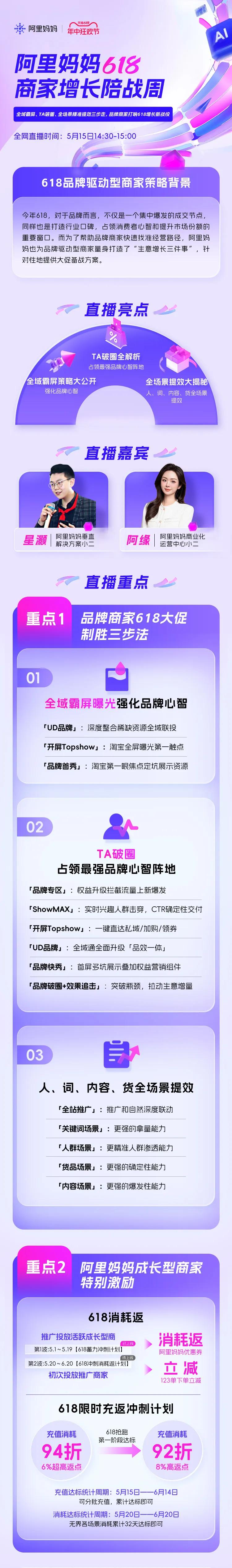 在这三步之上,平台将在这个618提供重磅投入,包含付免联动流量协同、阿里妈妈与淘天深度协同,以及高额返点政策。同时,据了解,平台还将提供AI助力人群破圈、新质好货确定爆发和直播全时全域爆发的三大确定性机会,帮助商家实现TA人群破圈、好货打爆和直播间的高频爆发。