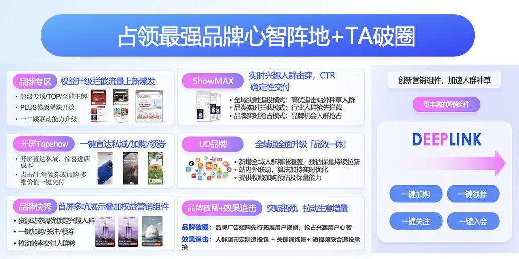 具体来说,为实现真正意义上的“全域霸屏”阿里妈妈此次集合了多项技术能力和产品更新,实现了从站外到站内公域以及品牌私域和搜索域的全链路覆盖。