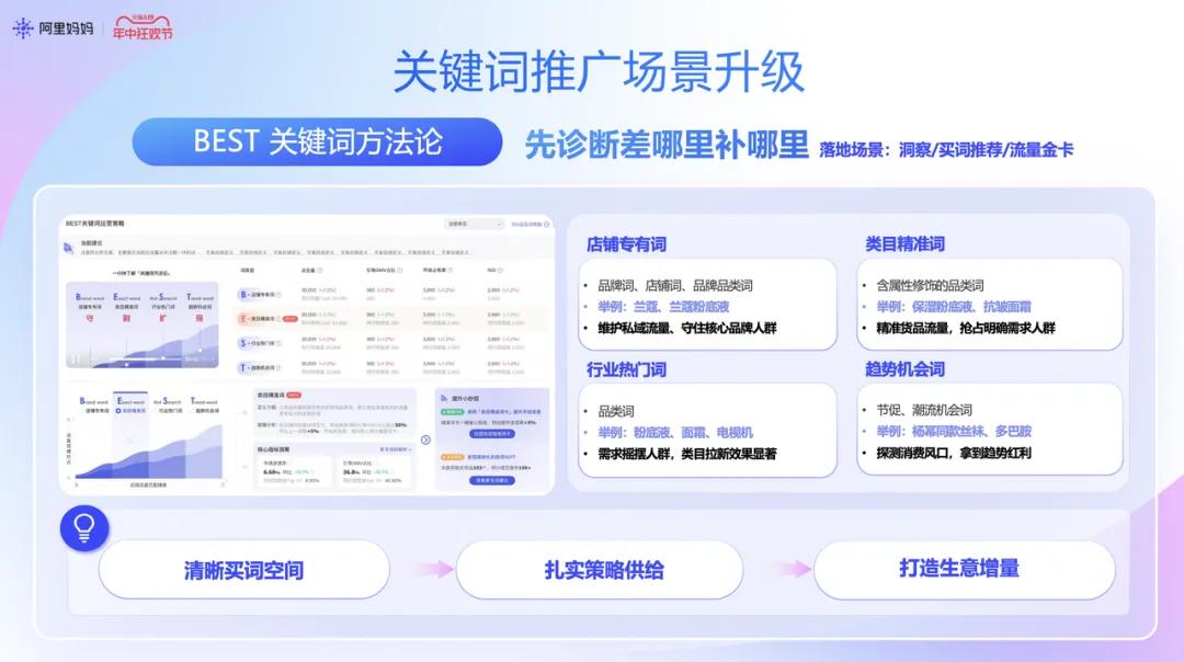 这一系列功能主要包含全站推广智能选品、抢词计划、定制流量金卡、搜索卡位等。其中,关键词场景下,阿里妈妈推出BEST关键词方法论,通过行业热门词、趋势词的探测,帮助商家实现搜索卡位、类目拉新,触达摇摆人群,预测消费风口抢占先机。值得特别关注的是搜索卡位和流量金卡。