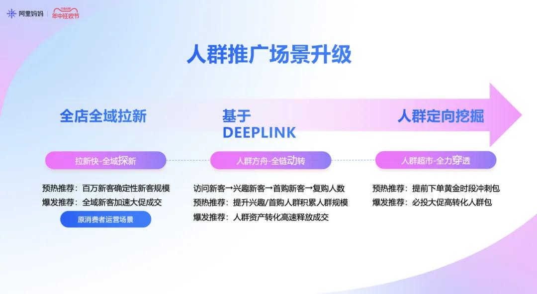 人群场景下,正如上文提到的,拉新快、人群方舟和人群超市升级后所带来的人群触达能力,可以帮助品牌商家实现人群拉新更精准、人群流转更高效、人群渗透更可控。