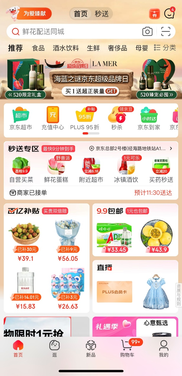 【亿邦原创】5月18日消息,日前,京东App首页进行改版,首页的百亿补贴和9.9包邮频道上方新增上线了“秒送专区”。消费者打开京东进入秒送专区,可以体验最快9分钟送到手的即时零售服务。