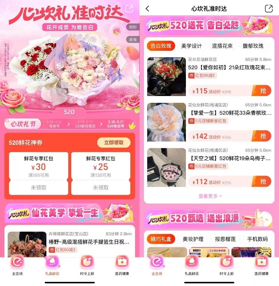 消费者上饿了么搜“心坎礼”,还可领最高价值520元的节日券包。