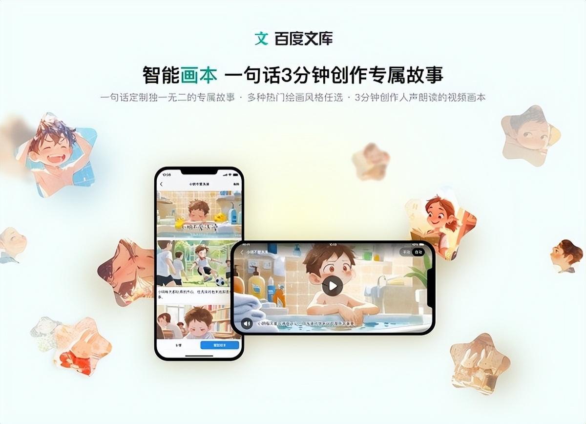 同时,百度文库在跨模态AI技术、产品能力等方面实现飞跃。「智能画本」在行业率先实现「图文声并茂」的AI视频画本创作能力,可以一句话、几分钟就创作出图文并茂、人声朗读的视频画本。父母可以为孩子进行专属故事创作,未来还可以进行自定义配音,增强亲子互动乐趣,门槛更低、操作更简单。