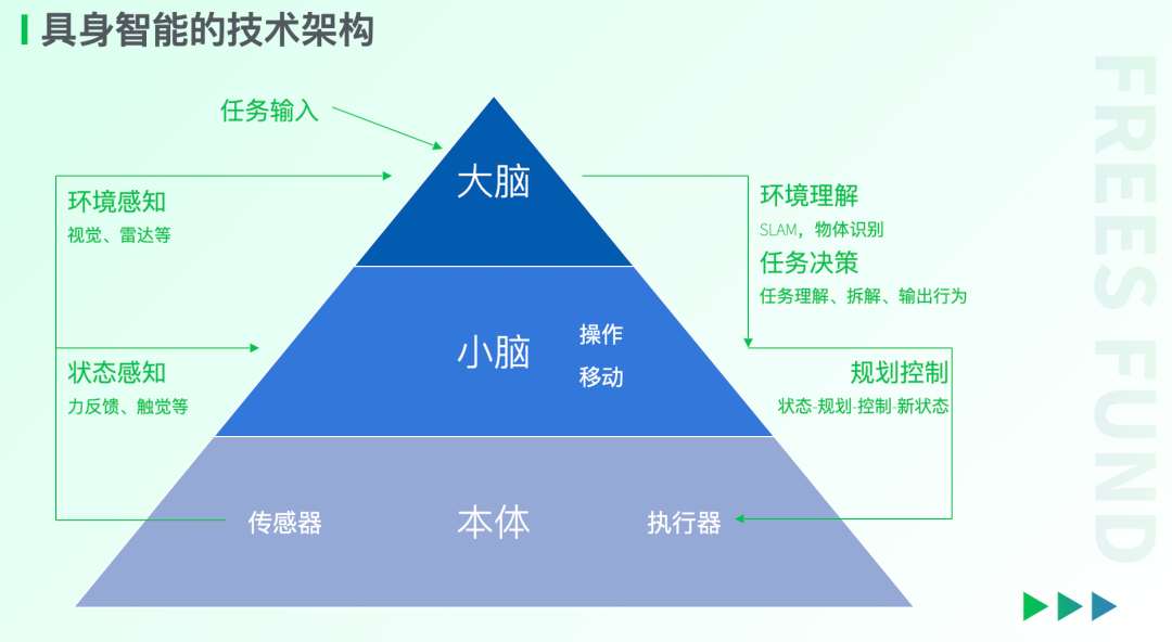 具体到具身智能的技术架构,我们按照行业共识可以将它拆解成三层来理解。最底层是硬件的本体,我们可以将其类比成人的身体,除了肌肉、骨骼,还包括感知器官(传感器)、手足(执行器)等等。再往上一层是控制运动的功能,相当于人的小脑,最上面一层就是大脑,是我们负责思考来进行规划决策和环境理解的能力。