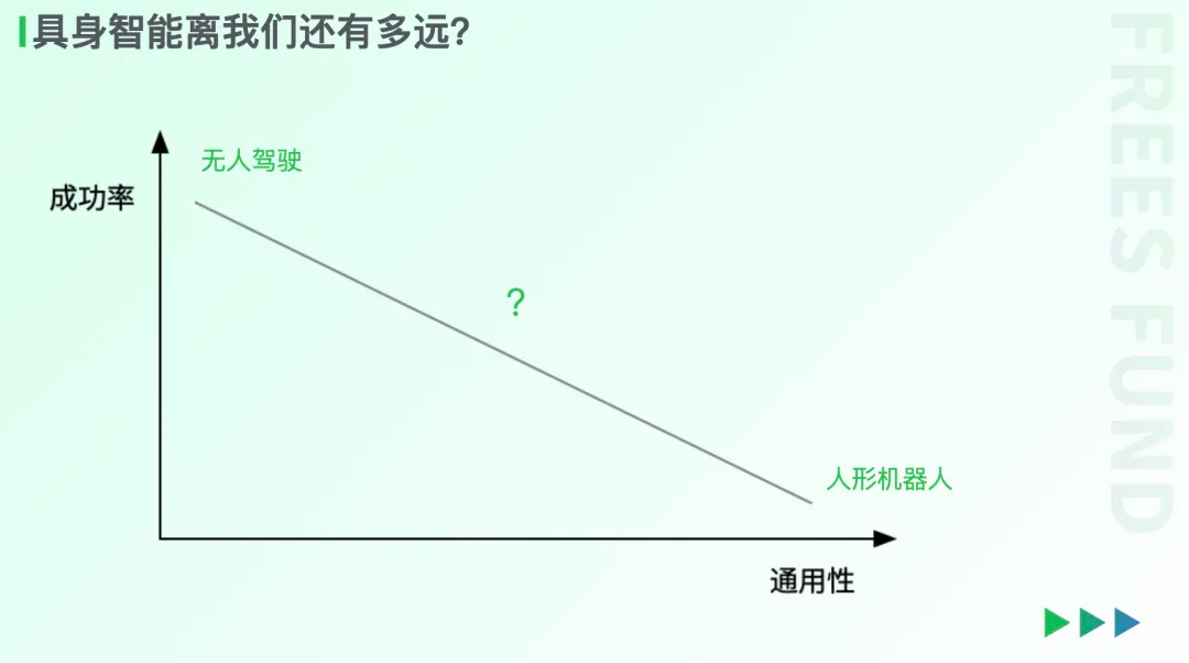 以大家比较熟悉的无人驾驶、人形机器人为例。这两个概念早在十年前就已经有了,至今大家也还在探索它们的商业化落地。无人驾驶不追求通用性,但对成功率有极高的要求。人形机器人追求的是通用性,但在现实里实现泛化的成功率较低。