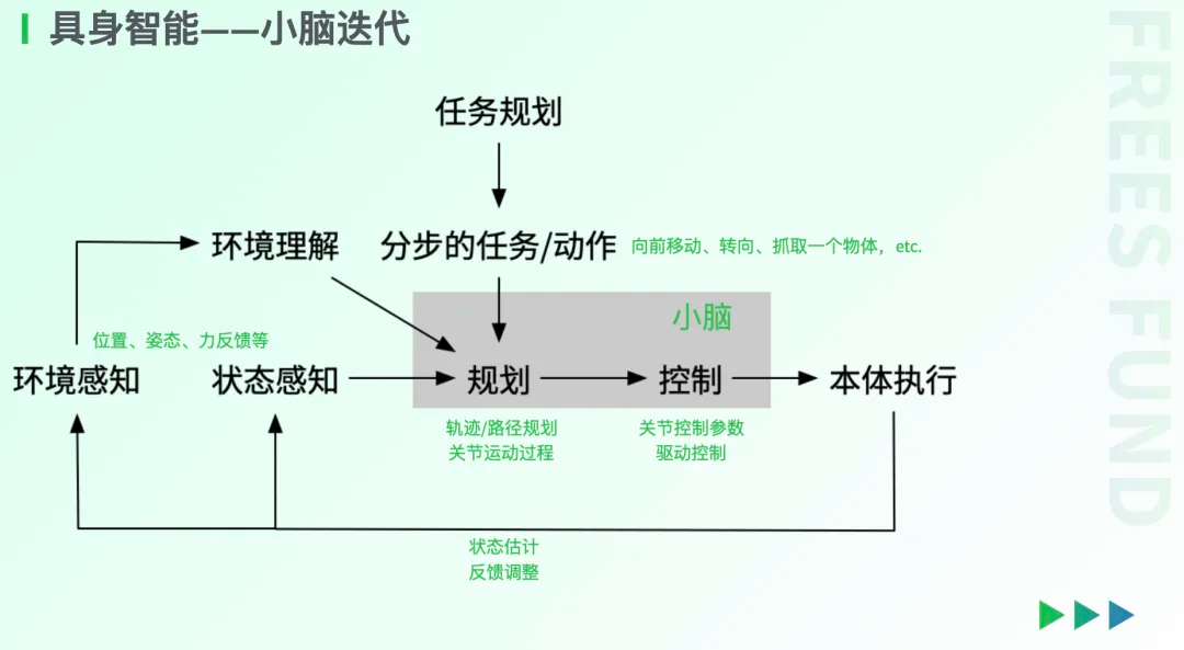 总体而言,具身智能的技术架构,就是由“大脑”这一层来做环境和任务的理解,并进行决策和拆解任务,由“小脑”这一层来规划和控制,再由“本体”这一层执行任务。当然,这个过程中还需要传感器的数据来帮助“大脑”和“小脑”更好地去理解和控制“本体”。后面我们会再就这三层架构进行具体分析。