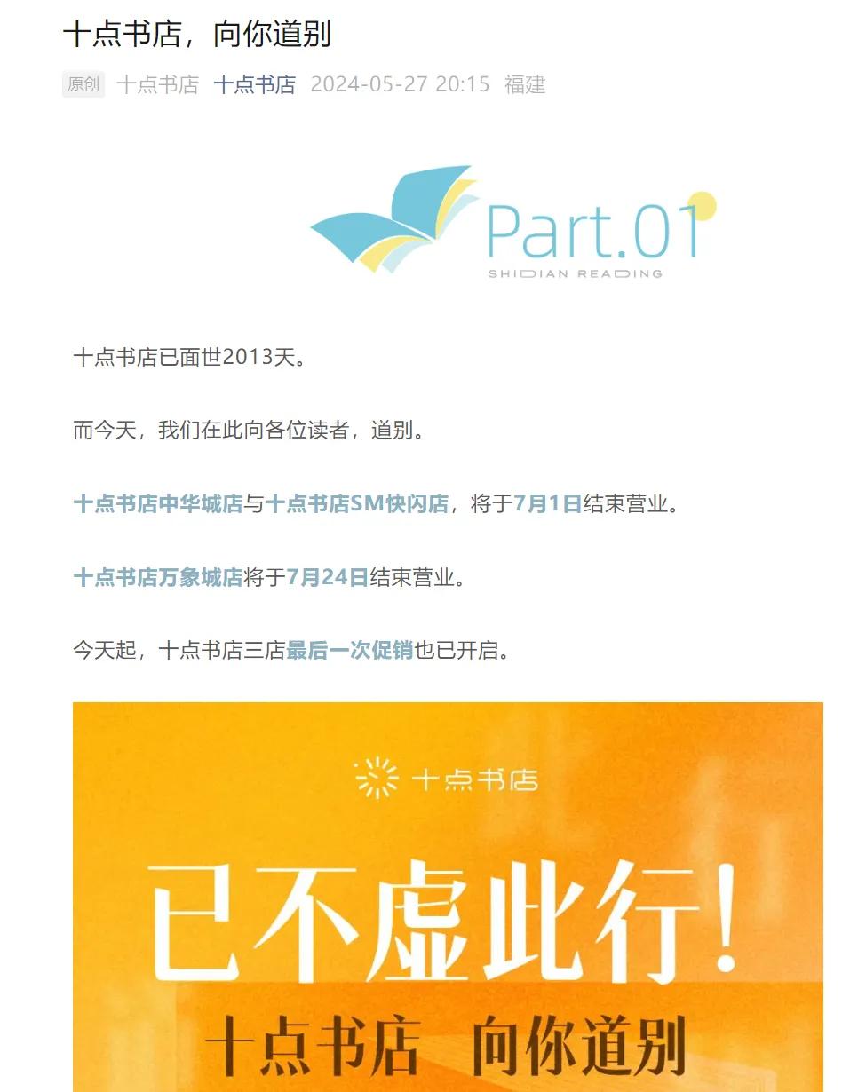 5月27日晚,十点书店发布通知称,旗下位于福建的三间门店将于7月结束营业。其中,十点书店中华城店与十点书店SM快闪店,将于7月1日结束营业。十点书店万象城店将于7月24日结束营业。这也意味着,十点书店正式关闭旗下的所有门店,退出实体书店行业。