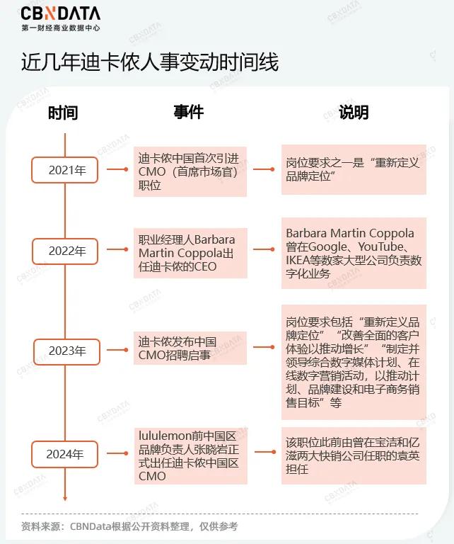 2021年,迪卡侬中国首次引进CMO(首席市场官)职位,并开出可观薪资;2022年,曾在多家大型公司负责数字化业务的职业经理人Barbara Martin Coppola出任迪卡侬CEO;2024年年初,lululemon前中国区品牌负责人张晓岩正式出任迪卡侬中国区CMO。