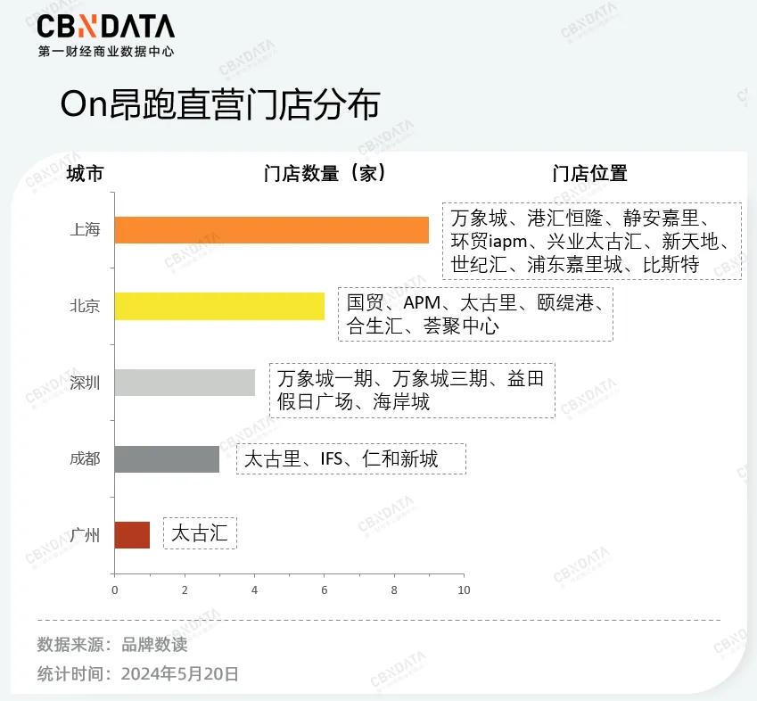 这一成绩和昂跑在中国的拓店投入分不开,据公开数据显示,2023年期间,昂跑在全球仅新增15家直营零售店,其中10家位于中国。截止目前,昂跑在中国的22家直营门店分布在上海、北京、深圳、广州、成都五个城市的中高端核心购物中心,这些优质的购物中心渠道推动了昂跑的DTC业务营收增长。