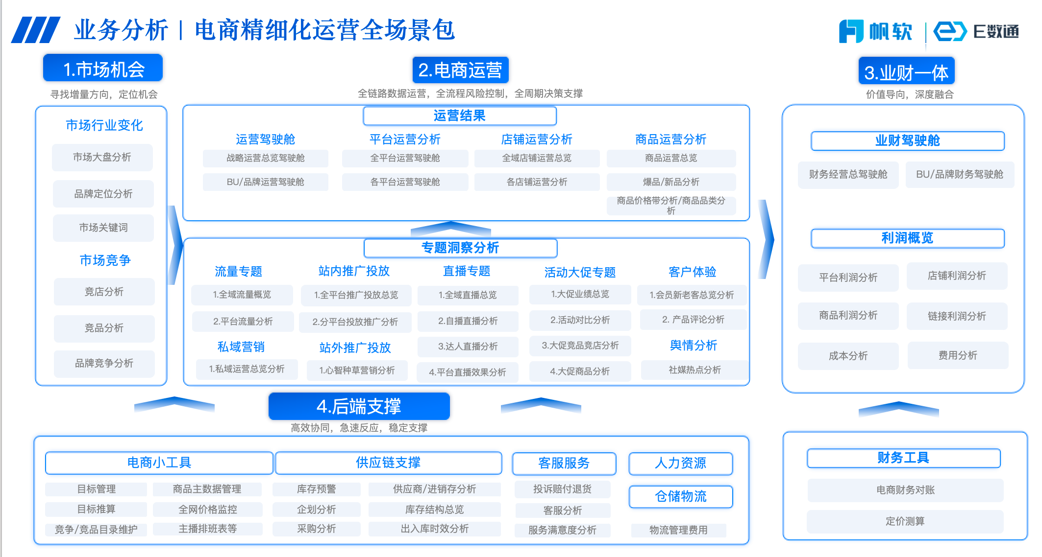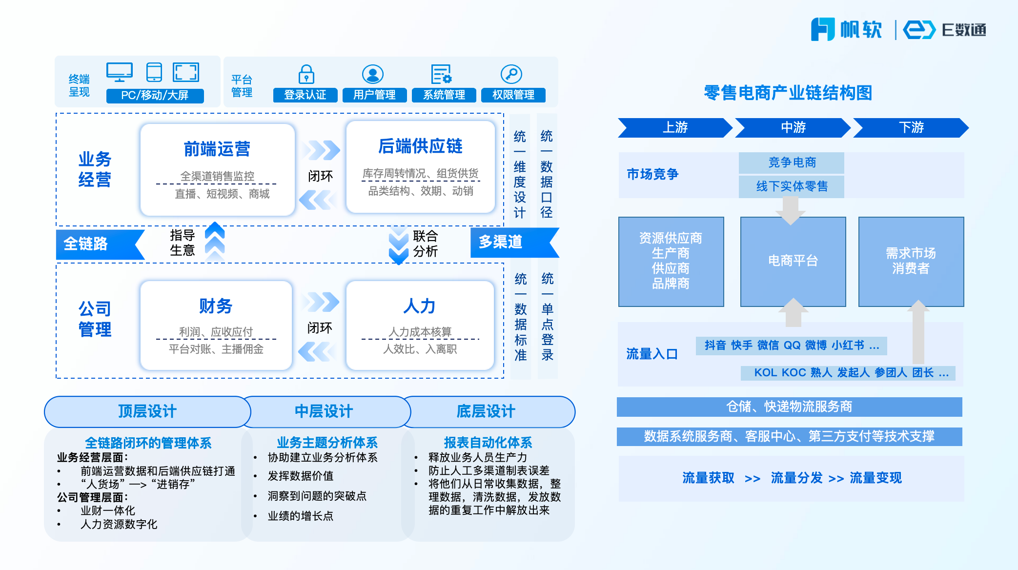 为服务更多电商客户的需求,帆软推出了专门针对电商用户的“E数通”系统。E数通可每日自动抓取不同来源的数据,包括电商平台(抖音、淘宝、天猫等)、业务系统(内部OA系统、ERP系统等)、行业数据等,保障数据全面且准确。同时,E数通支持用户抓取不同类型的数据,如平台数据、订单数据、用户数据、营销数据等,帮助用户依据客观数据进行决策。