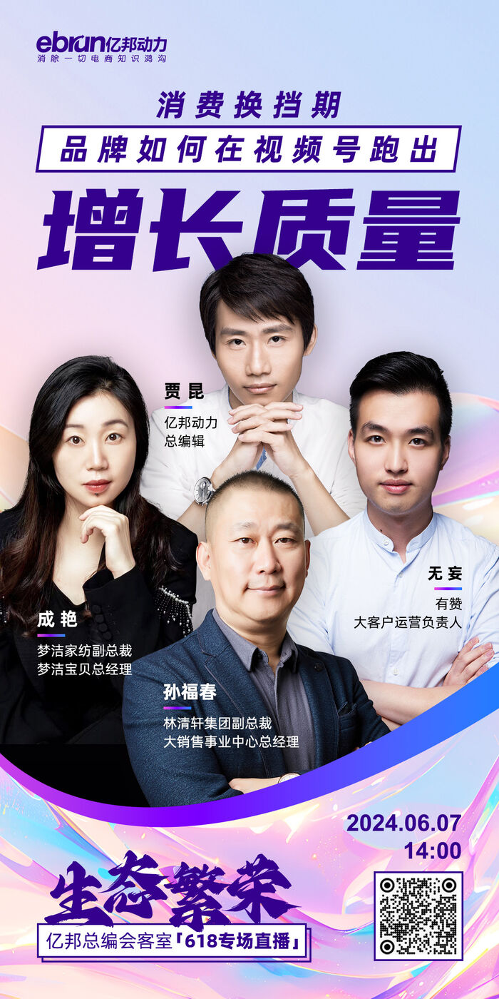 6月7日,亿邦总编会客室618专场,将举办一场针对视频号电商的直播分享,邀请林清轩、梦洁家纺等头部玩家,重点探讨大促挑战、市场机会和视频号打法。对此感兴趣的朋友,可扫码预约这场直播。