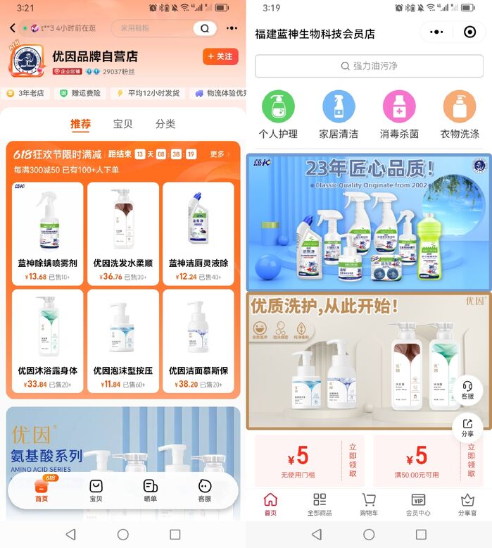 值得注意的是,天眼查显示,福建蓝神生物科技有限公司曾用名为“福建宝泰电子商务有限公司”,是旗下品牌优因和蓝神的淘宝自营店的主理企业。