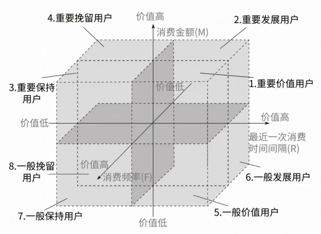 基于用户价值的分层经常用到的模型就是我们常见的RFM模型,通过客户的消费时间间隔(Recency)、消费频率(Frequency)以及消费金额(Monetary)三项指标来描述客户的价值状况。
