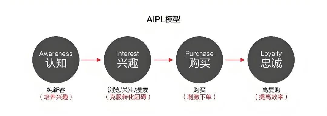 阿里则提出了AIPL模型,认为最终成交用户是从认知开始的,用户先对品牌有认知,之后产生兴趣,有了兴趣之后产生购买行为,多次购买之后形成忠诚用户。
