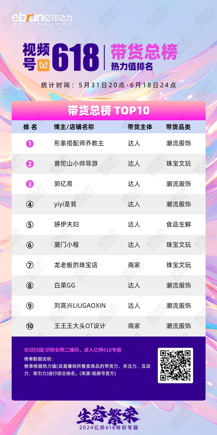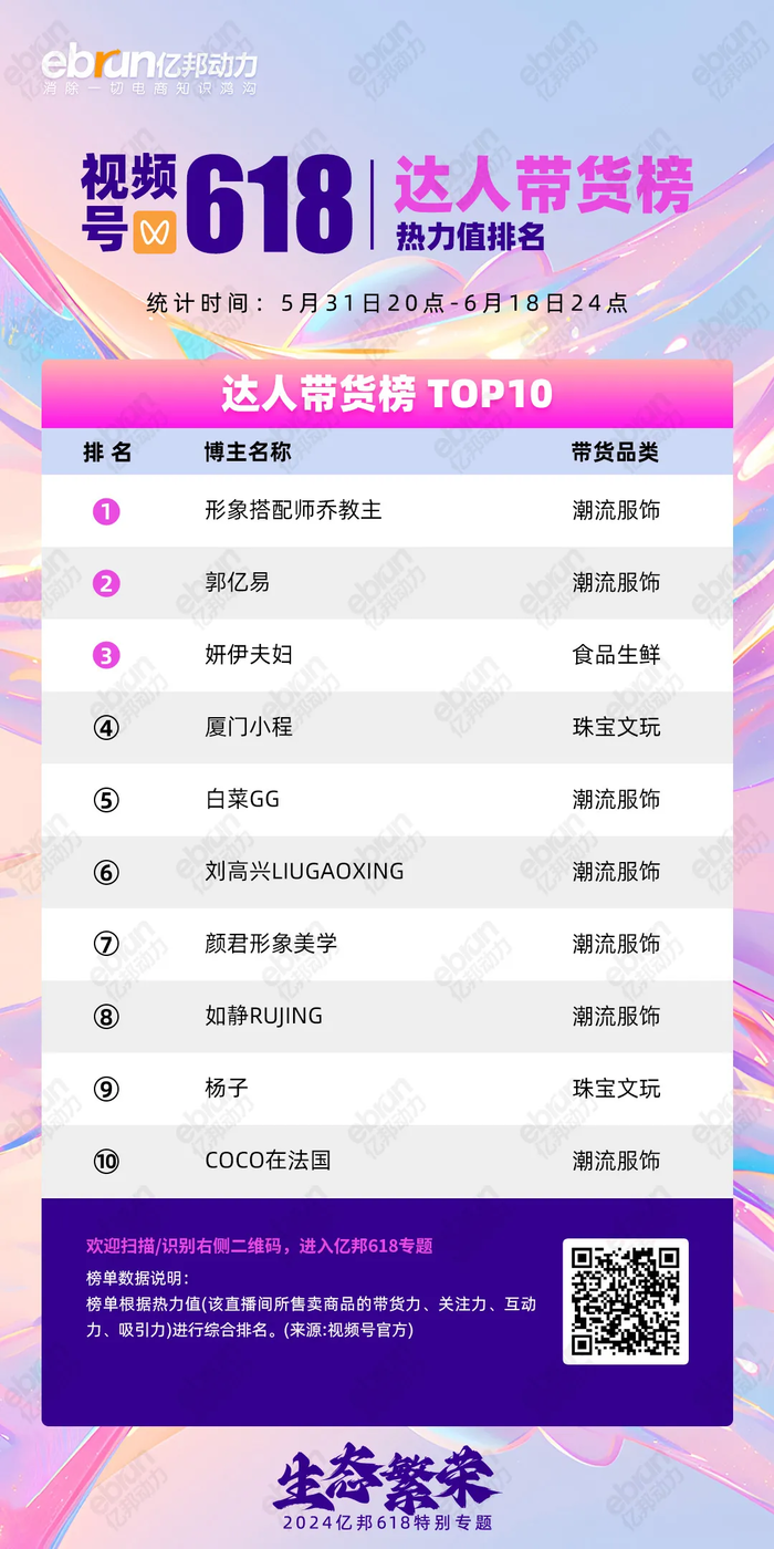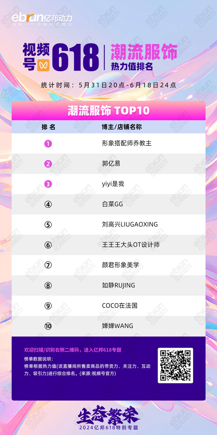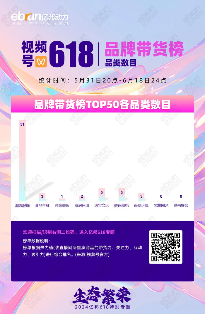 1. 品牌渠道建设加强:潮流服饰类目在品牌带货榜TOP50中占31个,前十占5席,吸引设计师品牌和淘品牌加码,展示用户行为向视频号迁移趋势。