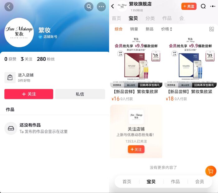 【亿邦原创】日前,夸迪前主理人枝繁繁创立美妆个护品牌“繁妆” 。该品牌在天猫、抖音开设官方旗舰店。截至6月25日17:30,该天猫店铺仅有两款产品,均为次抛精华液小样,粉丝数不到1500;抖音店铺账号粉丝数不足300,暂无商品和作品。