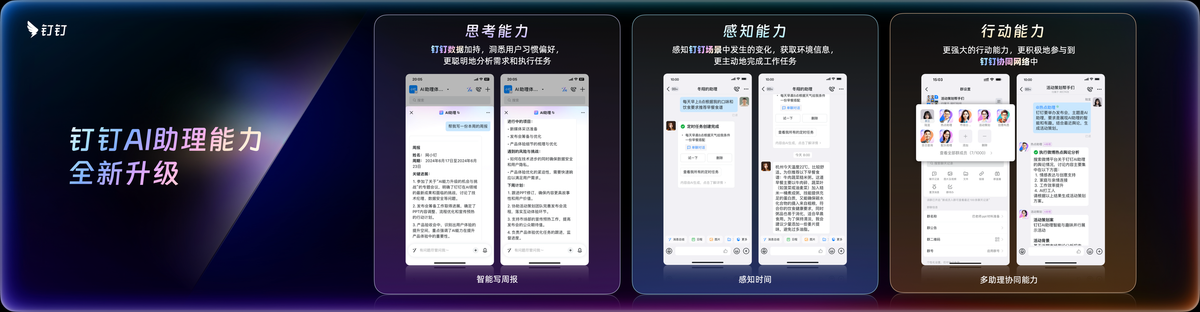 在产品能力方面,钉钉大幅升级了AI助理的思考系统、感知系统和行动系统。