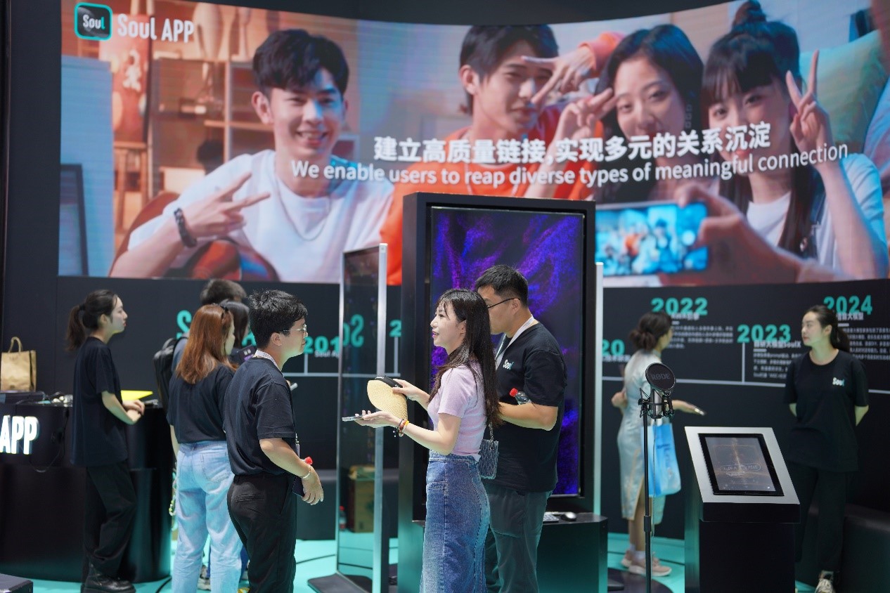 在WAIC 2024活动现场,Soul App以“科技无界,心与智连”为主题呈现展台,并重点展示了“数字分身”“狼人魅影”和“异世界回响”三个新功能/场景,这也是Soul在探索“AIGC+社交”场景深度融合的最新实践。