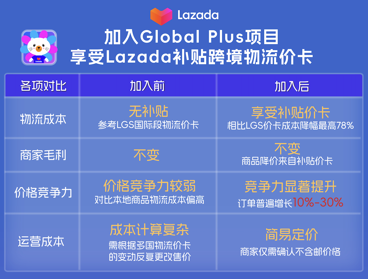 据公开信息显示,Global Plus是Lazada针对跨境商家推出的全新物流定价系统。该系统为商家提供头程物流补贴,可有效降低跨境物流成本,提升商品价格竞争力。商家加入Global Plus后,订单普遍增长10%~30%。