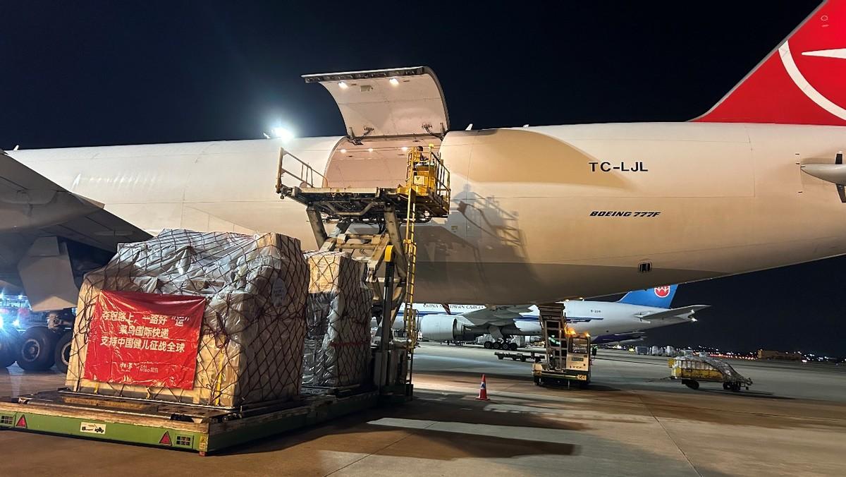 图说:在广州白云国际机场,菜鸟国际航班运输“中国之家”物资前往法国巴黎
