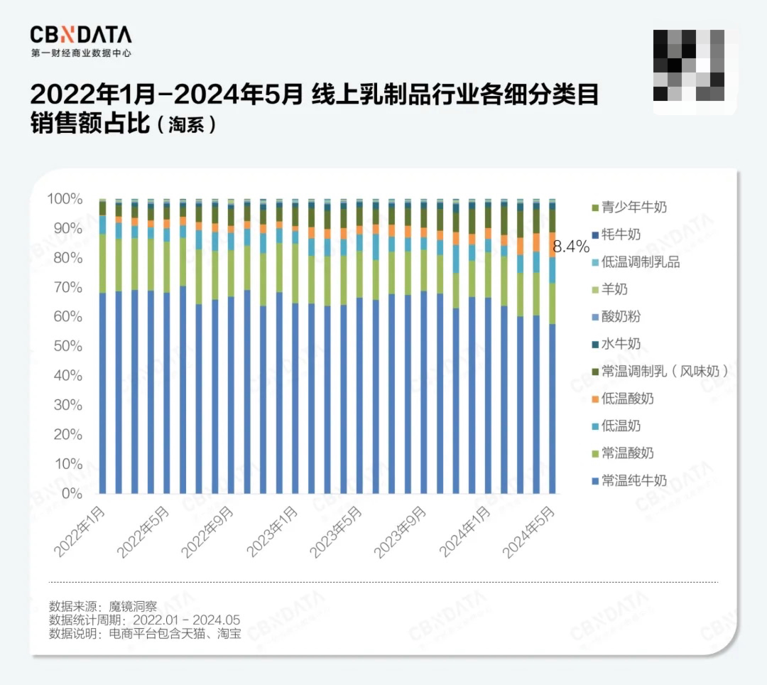 2024年5月,低温酸奶的销售额占比达到8.4%,较2022年1月提升了超8个百分点,已经成为整个乳制品行业中不可忽视的一条细分赛道。