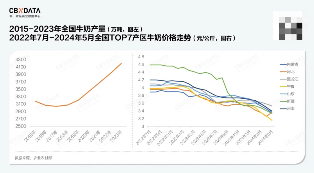 根据国家统计局数据,我国牛奶产量自2017年开始持续走高,2023年达到4196.65万吨,同比增长6.74%。与居高不下的产能相对应的,是跌跌不休的原奶价格,农业农村部最新数据显示,截至今年5月,国内原奶收购价格已经同比连跌27个月,为2010年以来最长一次。而在7月3日举行的2024中国奶业发展战略研讨会上,国家奶牛产业技术体系首席科学家李胜利表示,由于牛奶原奶收购价持续下跌,奶价和成本出现了国家奶牛体系有记录以来的首次倒挂。
