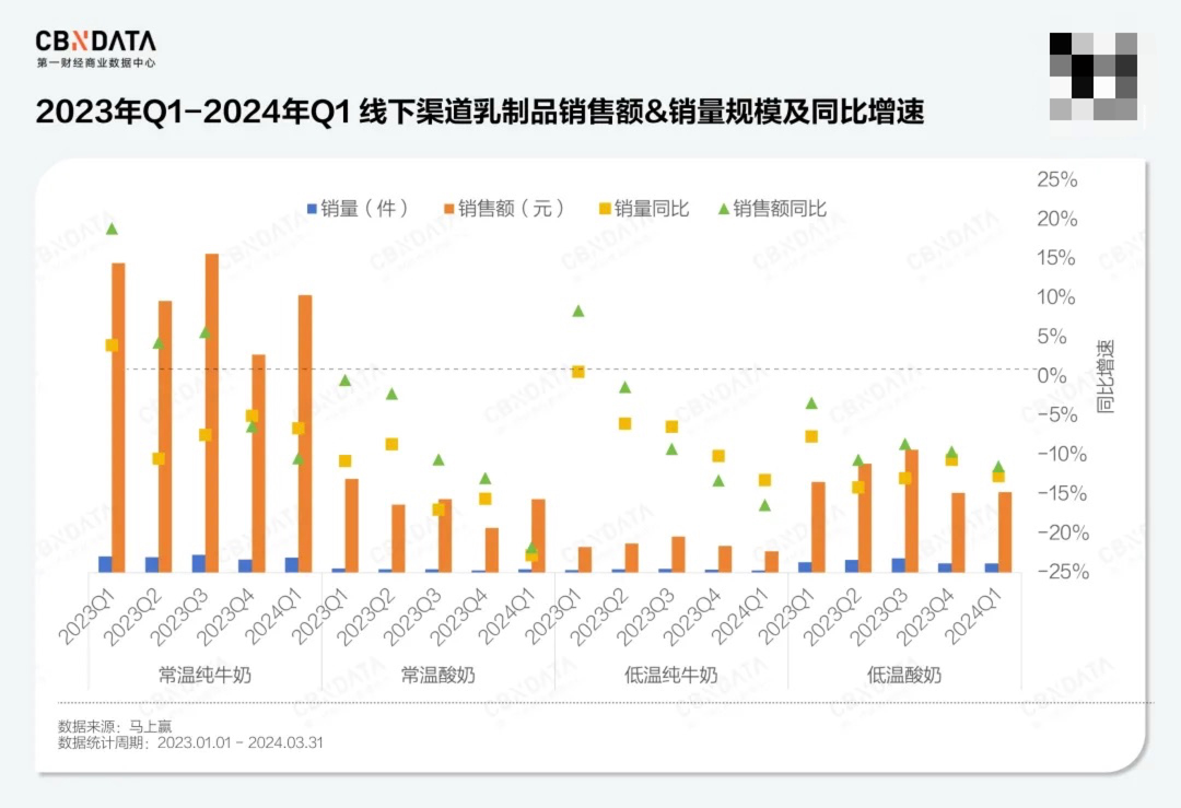 具体到传统线下渠道而言,乳制品整体增长乏力。马上赢数据显示,线下酸奶品类在2024年1季度整体销售额同比下降11.46%,销量同比下降12.69%,而对比常温酸奶销售额和销量均超过20%的同比降幅,低温酸奶在整体乳制品细分品类中已经处于降速较低的水平。