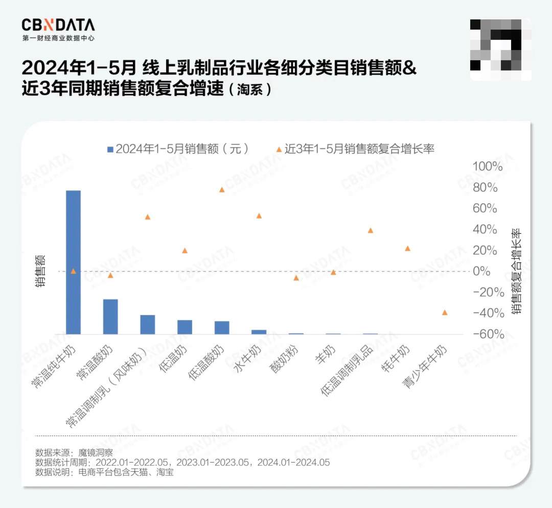 与线下的低迷相比,线上渠道则呈现出一番不同的景象。魔镜洞察数据显示,淘系电商平台近三年1-5月整体乳制品销售额复合增速为6.29%,低温酸奶近三年复合增速为78.4%,在所有细分类目中增速最高;而包含了低温酸奶、低温奶、低温调制乳品的低温乳制品类目复合增速(39.8%)也显著高于常温赛道(3.32%)。