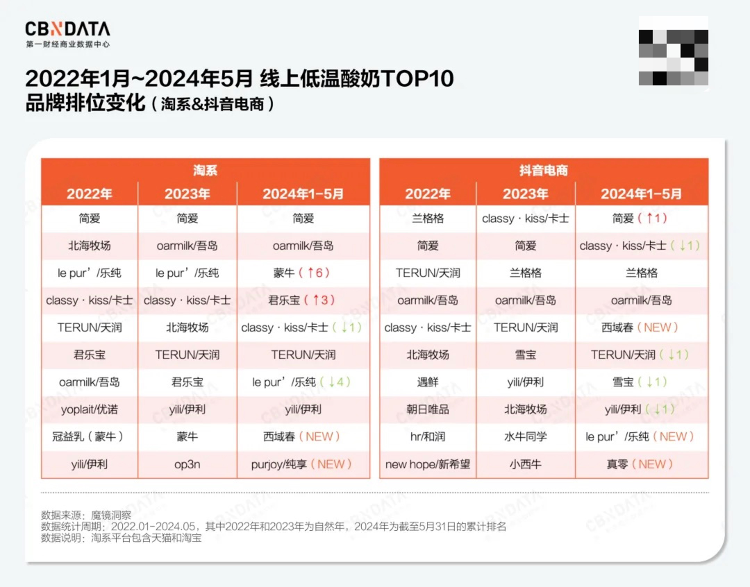 不过这也并不意味着后来者不可以居上。从品牌线上销售整体表现来看,简爱、吾岛、乐纯这些新生代品牌在淘系和抖音电商依然守住了自己的市场占位。除此之外,一些品牌选择在渠道端错位竞争,比如兰格格和雪宝,这两大品牌在抖音平台的表现尤为突出。综合来看,简爱、吾岛、卡士、天润和伊利是连续3年在淘系和抖音电商都稳占低温酸奶TOP10的品牌。