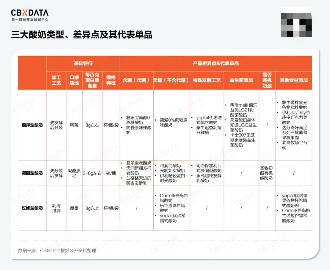 对于低温酸奶而言,当前市场上的产品根据不同工艺主要可以分为搅拌型酸奶、凝固型酸奶和过滤型酸奶三大类型;除此之外,还可以根据有无糖分添加、是否采取特殊发酵工艺、是否添加专利菌群、是否采用有机奶源等因素进行更进一步差异化产品设计。