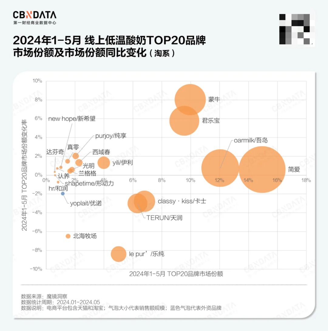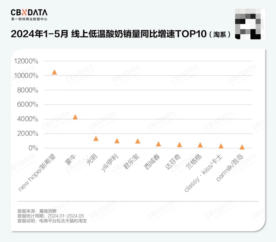 值得注意的是,近两年传统乳企在线上渠道持续发力,线上低温酸奶的大众基本盘被快速锁定。2024年1-5月,低温酸奶类目下蒙牛和君乐宝销售额同比增速分别高达900%+和400%+,市场份额同比分别提升约8和5个百分点,而同期销量增速TOP5品牌也均为这些定位大众市场的传统乳企。
