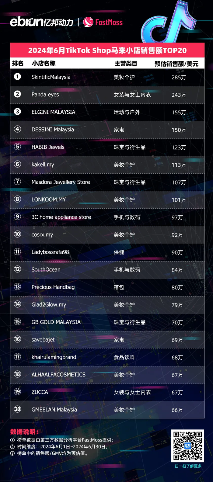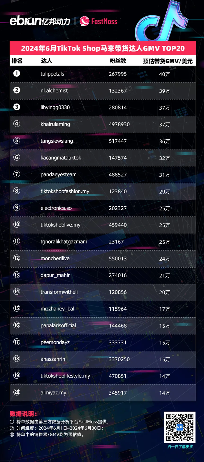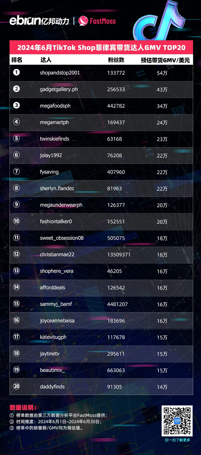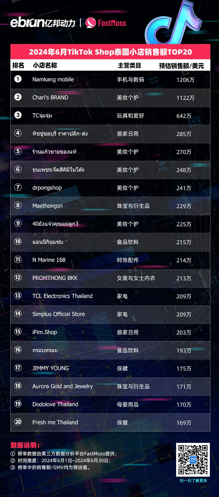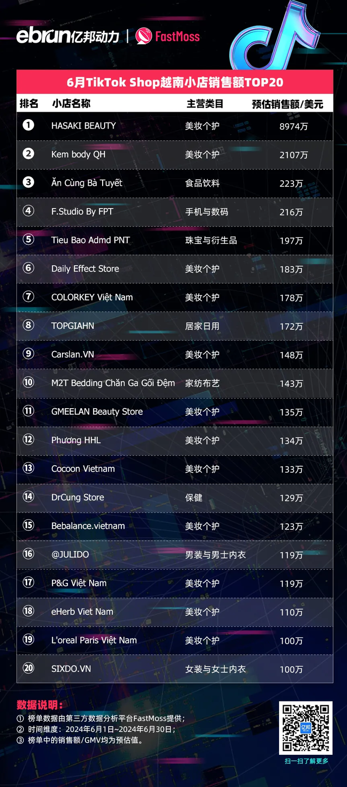 数据说明:榜单数据由TikTok第三方数据智能分析平台FastMoss提供,统计时间为2024年6月1日-6月30日,非官方数据,且销售额为预估值,或与实际情况有部分出入,敬请谅解。
