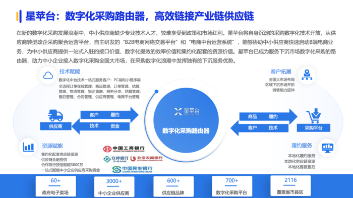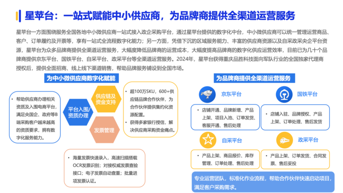 星苹台已成为服务下沉市场数字化采购的路由器,助力中小企业接入数字化采购全国大市场,在来购数字化浪潮中发挥独有的下沉服务优势。助力中小型政企供应商一站式接入数字化采购平台,为政府、军队、央国企等提供数字化采购服务。2024年,星苹台获得重庆品胜科技面向军队的全国独家代理商授权,为重庆品胜科技提供全面招商、线上线下渠道销售服务,将品牌服务铺设至全国市场。