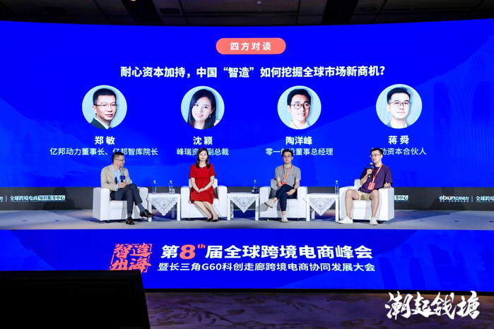 在7月18日举办的“潮起钱塘·第八届全球跨境电商峰会”上,峰瑞资本副总裁沈颖、零一创投董事总经理陶洋峰、盈动资本合伙人蒋舜一起就“耐心资本加持,中国“智造”如何挖掘全球市场新商机”这一主题进行讨论,亿邦动力董事长、亿邦智库院长郑敏担任互动主持。