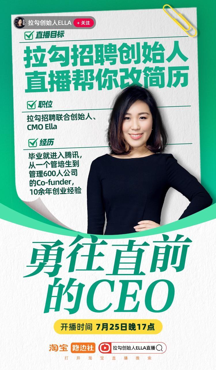 自淘宝推出“勇往直前的CEO”计划以来,一大拨企业家正涌向淘宝直播间。7月25日,拉勾招聘创始人Ella,也将开启入淘首秀,直播间在线问诊职场难题。