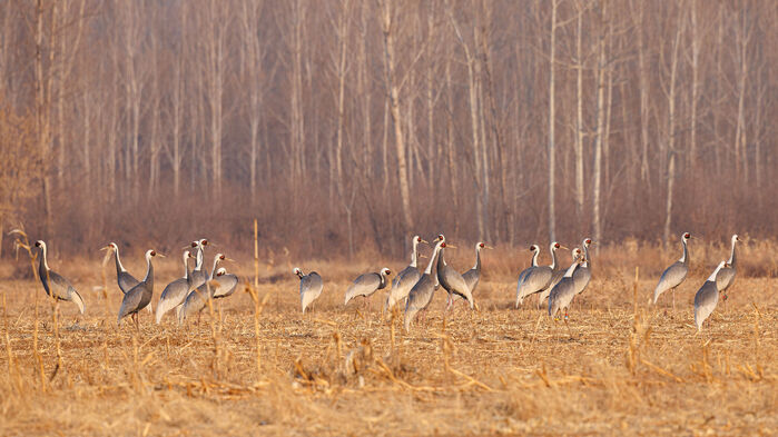 图:国家一级保护动物白枕鹤正在北京密云近自然森林经营及鸟类栖息地优化项目地停歇觅食
