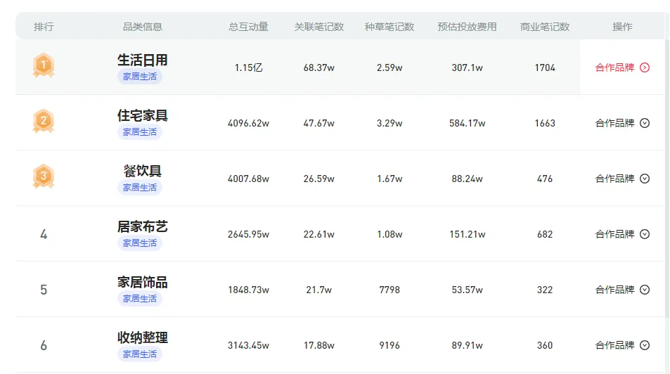 以家居家装类目为例,近30天数据显示,排在首位的是“生活日用”,总互动量高达1.15亿,种草笔记数2.59w;